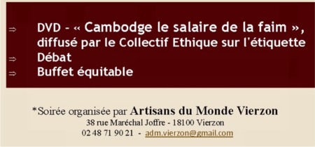 Après le DVD sur les ouvrières du textile au Cambodge et le débat nous partagerons un buffet. Merci à ceux et celles qui pourront apporter quelque chose pour le buffet de nous le faire savoir et/ou de s'inscrire au magasin.