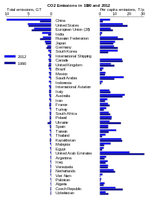 Évolution des émissions de CO2 par pays et par habitant entre 1990 et 2012.