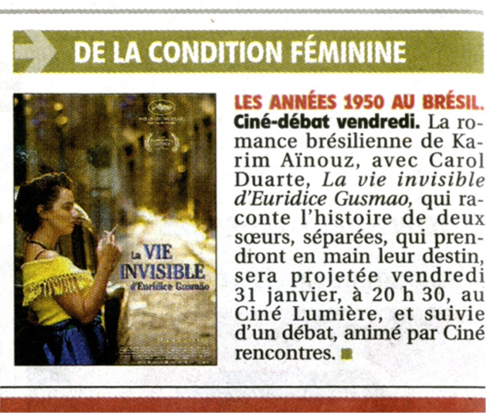 CHER(E)S AMI(E)S DE CINE-RENCONTRES, C’est ce vendredi, vendredi 31 janvier à 20h30, qu’on pourra voir la romance brésilienne de Karim Aïnouz avec Carol Duarte... «LA VIE INVISIBLE D'EURIDICE GUSMAO» (2019 - vost - 2h20) : Deux sœurs en quête d’émancipation. Bien entendu, si vous connaissez des personnes ou des associations susceptibles d’être particulièrement sensibilisées ou informées (Brésil, années 50, patriarcat, séparation, rêve et réel,…) n’hésitez pas à leur faire savoir qu’elles sont les bienvenues. Cordialement, Jean-Marie Favière Association Ciné-Rencontres. N’oubliez pas : tout ce que nous savons, nous le diffusons aussitôt sur le blog.