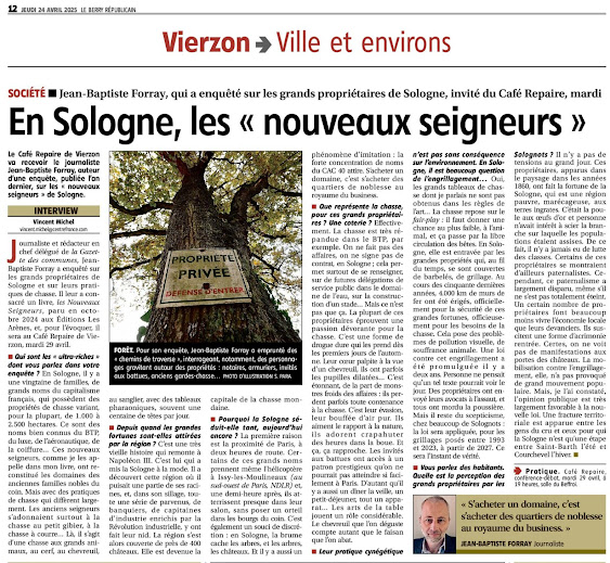 L'intervenant, Jean-Baptiste FORRAY, journaliste et auteur de plusieurs ouvrages, vient nous présenter son dernier livre "Les nouveaux seigneurs", résultat d'une enquête menée sur les terres solognotes.